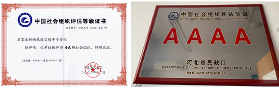近日,经过社会组织自评、业务主管单位初评、材料审核、实地检查、省评估委员会终审、媒体公示、受理复核等步骤,石家庄新铁轨道交通中专学校被河北省民政厅评定为4A级社会组织。